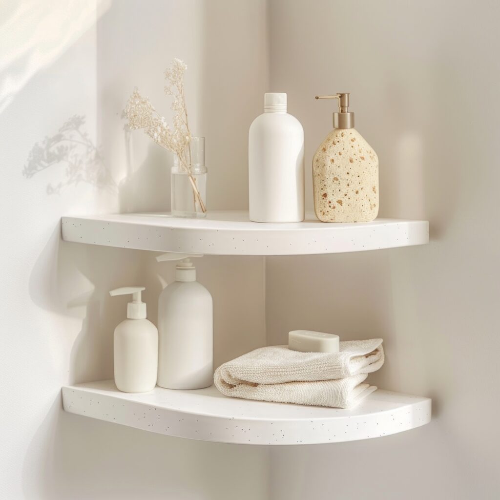 Make awkward corners work for you by installing shelves to hold extra supplies, plants, or small baskets.