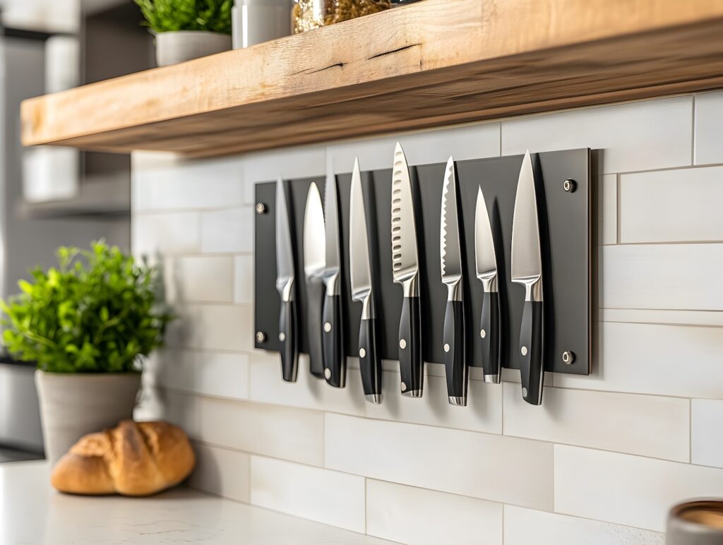 Small kitchen storage ideas wouldn’t be complete without magnetic knife strips or spice racks. Kitchen essentials remain insight and in-reach with these simple solutions.