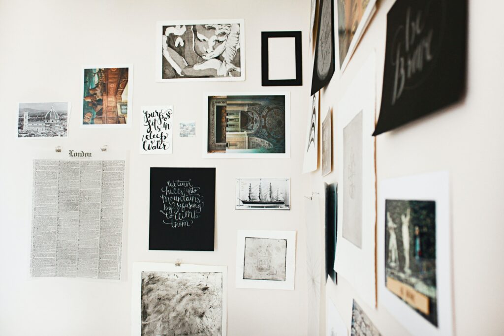 To create your own dark academia gallery wall, start with a dark and broody color scheme with deep green, navy, burgundy, and brown hues. For the art, you may choose to feature a mix of vintage and modern art pieces, such as oil paintings, prints, and black-and-white photographs. Some common motifs seen in a dark academia gallery wall include depictions of classical architecture, still lifes, portraits, and landscapes.