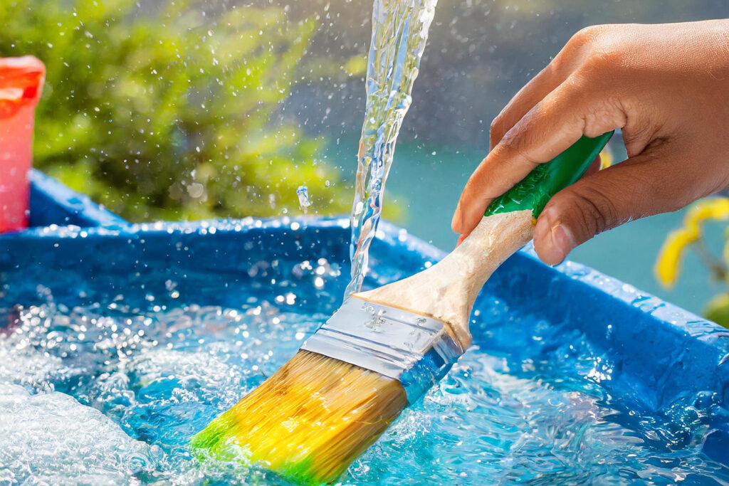 Clean water-based stains and sealers with water and soap. Clean oil-based stains and sealers with mineral spirits or paint thinner.