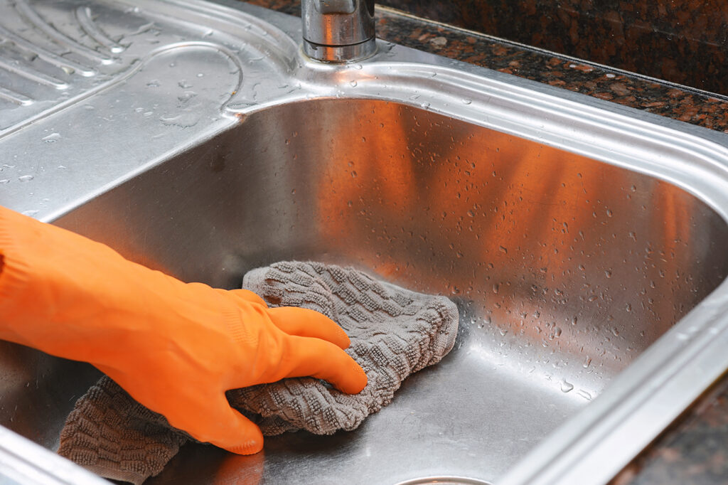 Once you’ve cleaned up any remaining spots that need it, rinse the sink again with hot water before drying it with a clean microfiber cloth. This will help it avoid getting water spots while maintaining its shine.