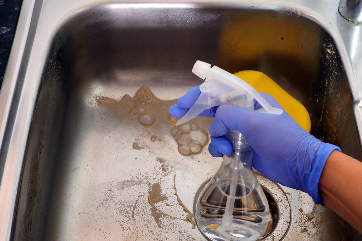 Begin by rinsing the sink thoroughly with hot water from the faucet. Make sure any surface dirt or debris is loosened and either sent down the drain disposal or caught in your drain strainer so you can throw it in the trash or compost bin. Note that when using your disposal, it’s always best to use cold water