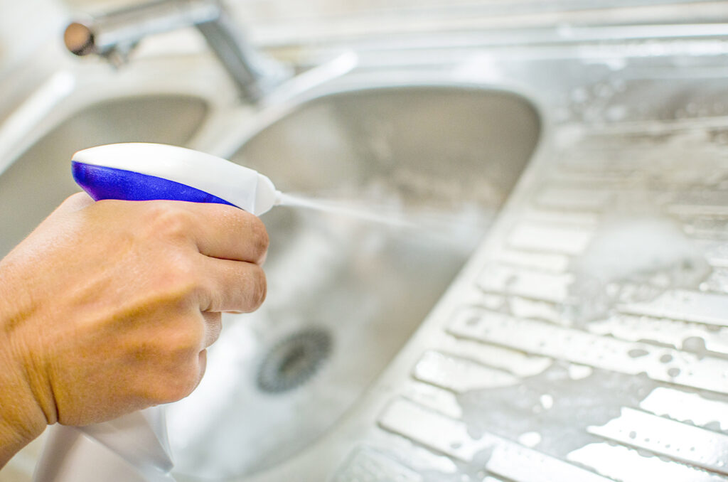 Once you’ve scrubbed the sink, use a spray bottle to coat it with distilled white vinegar. The vinegar will react with the baking soda, creating a foamy mixture that helps break down the harsher stains on stainless steel sinks. On top of being one of the best stainless steel sink cleaners out there, this mixture will also disinfect the surface. You can scrub it further to make sure any buildup or stains are fully removed.