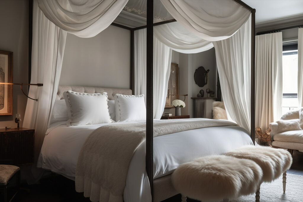 One style to try with mixing and matching furniture is a transitional style, which mixes modern and traditional pieces for a timeless and elevated look. In this example, traditional curtains and linens are paired with a modern bed frame, bedside tables, lamps, and benches for an elegant look. The neutral color palette also fits well into the transitional style.