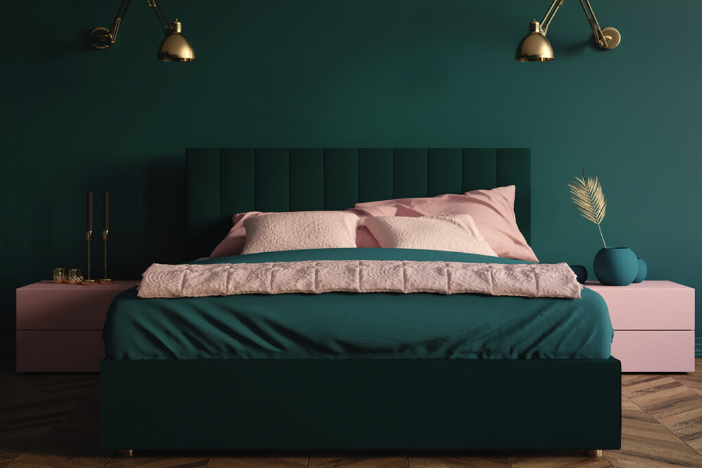Even if you have different color furniture in your bedroom, you can tie everything together with a unifying color. Colorful bedroom sets add personality and style to a space. In this example, the bedroom is decorated in shades of green with pink accents and features gold wall sconces.