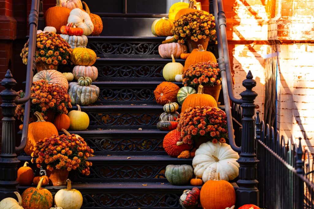 • Create a mini pumpkin patch on your front lawn, using a mix of real and artificial pumpkins in various sizes for added dimension.