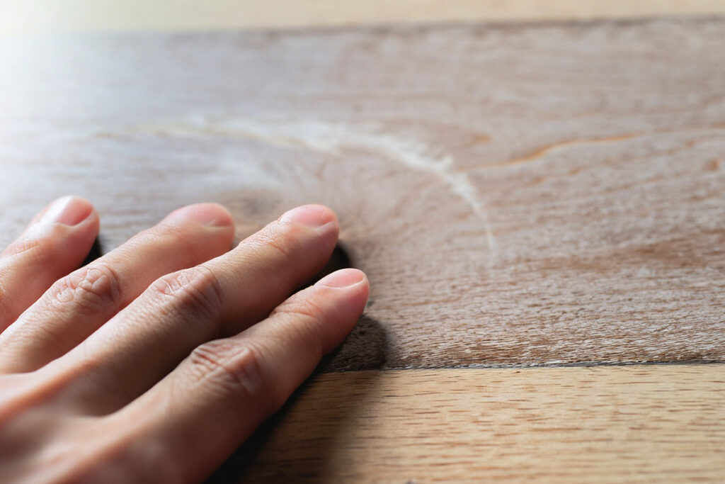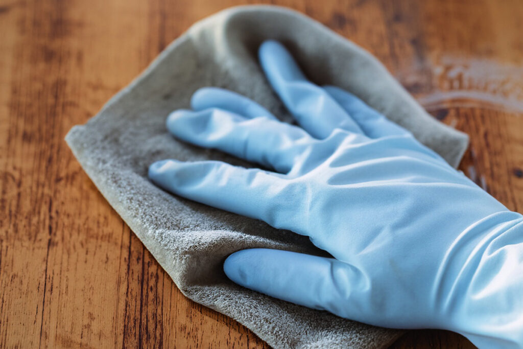Apply a deglosser or liquid sandpaper using rubber gloves to rub the application onto the wood with a cloth or any rag that doesn’t produce lint.
